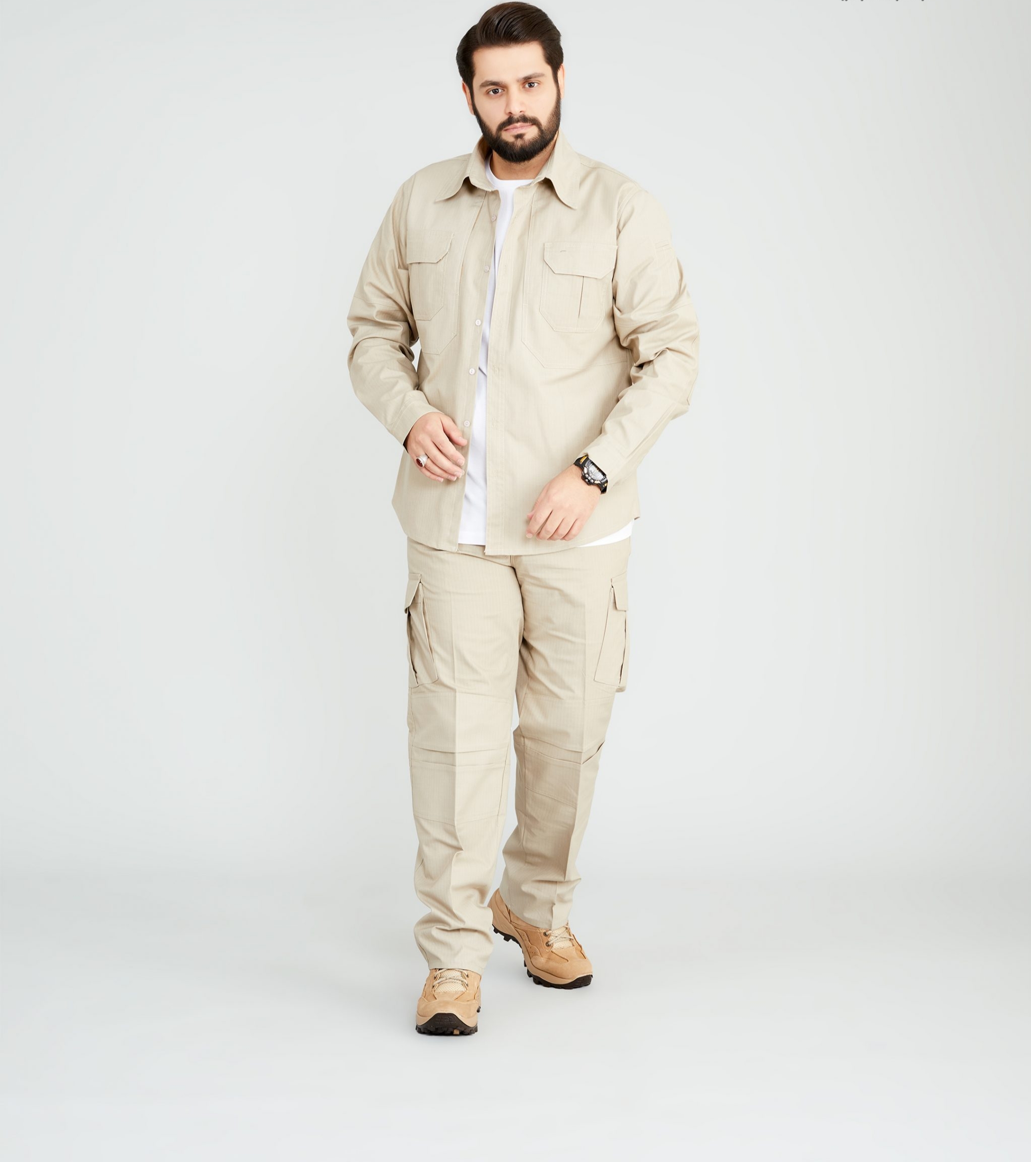 جنس و ترکیب: بافته شده از ترکیب پنبه و پلی استر با طرح بافت تافته و سرژه ریپ استاپ(شطرنجی)که در مقابل پارگی و جر خوردگی از مقاومت بالاتری نسبت به پارچههای معمول برخوردار است.